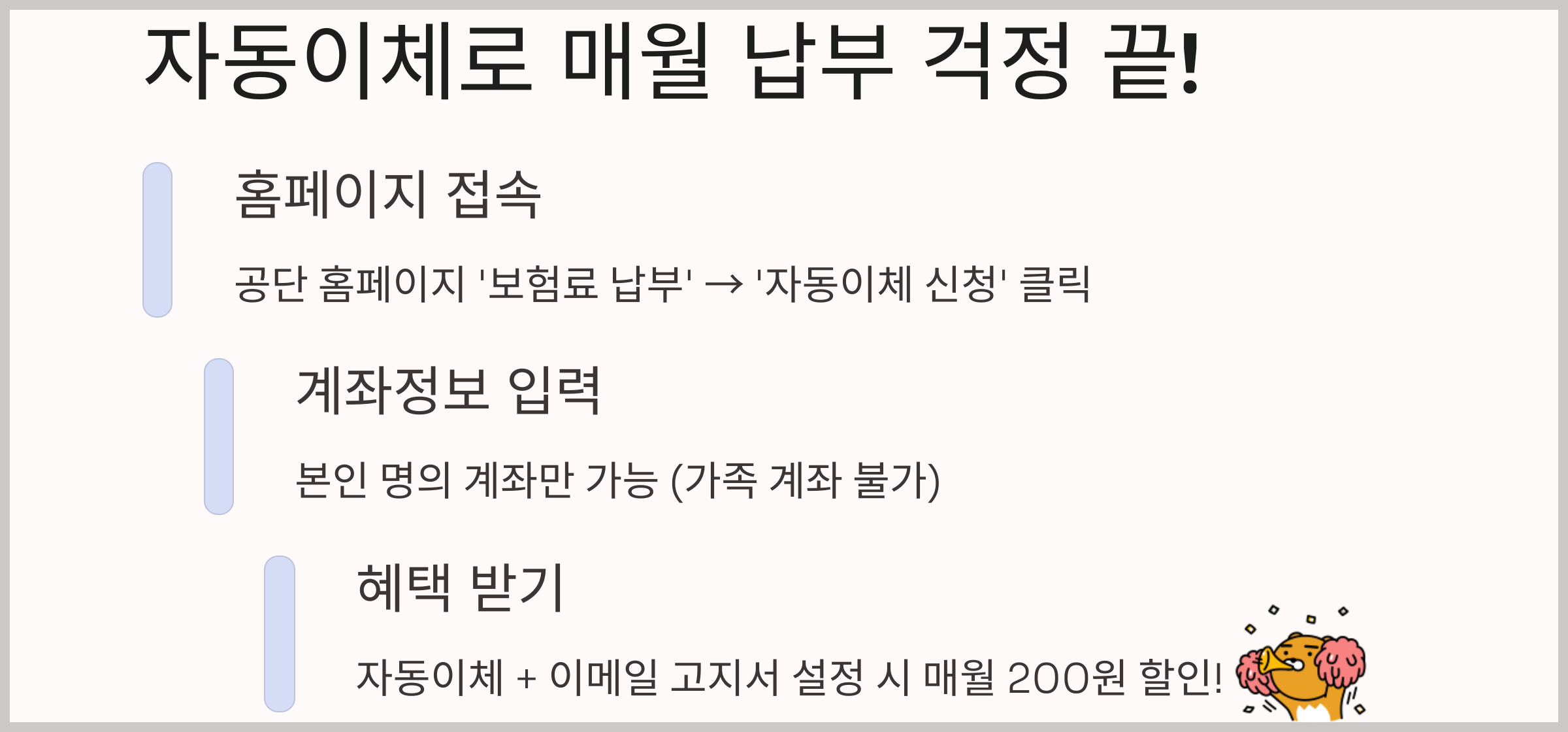 신청자 명의 계좌만 가능하다는 거예요. 가족 명의 계좌로는 자동이체가 안 되니 주의하세요~